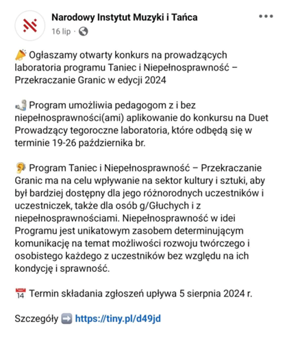Taniec i Niepełnosprawność – Przekraczanie Granic 2024. Otwarty konkurs na prowadzących laboratoria