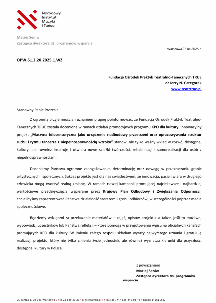 W miesiącach sierpień–październik 2024 roku Fundacja Ośrodek Praktyk Teatralno-Tanecznych TRUE zaprosiła do współpracy polskich tancerzy i pedagogów tańca.